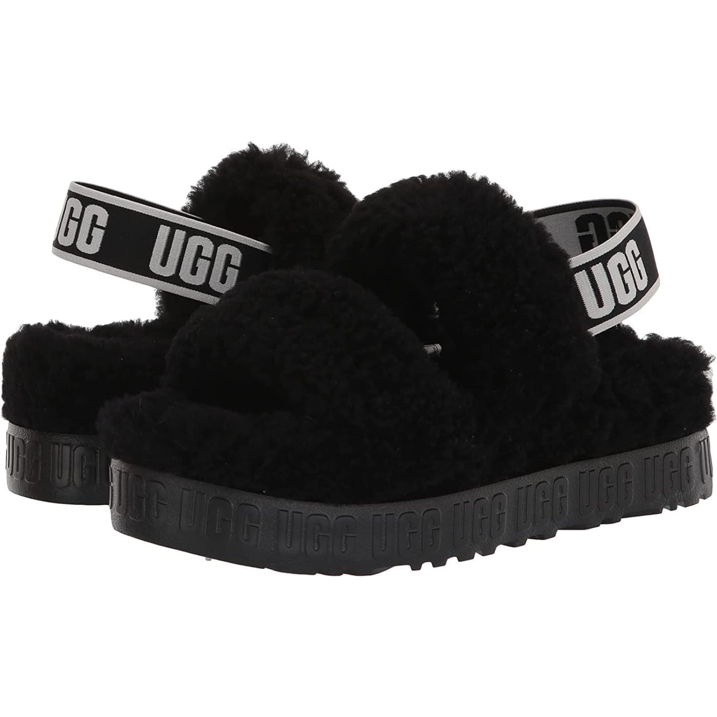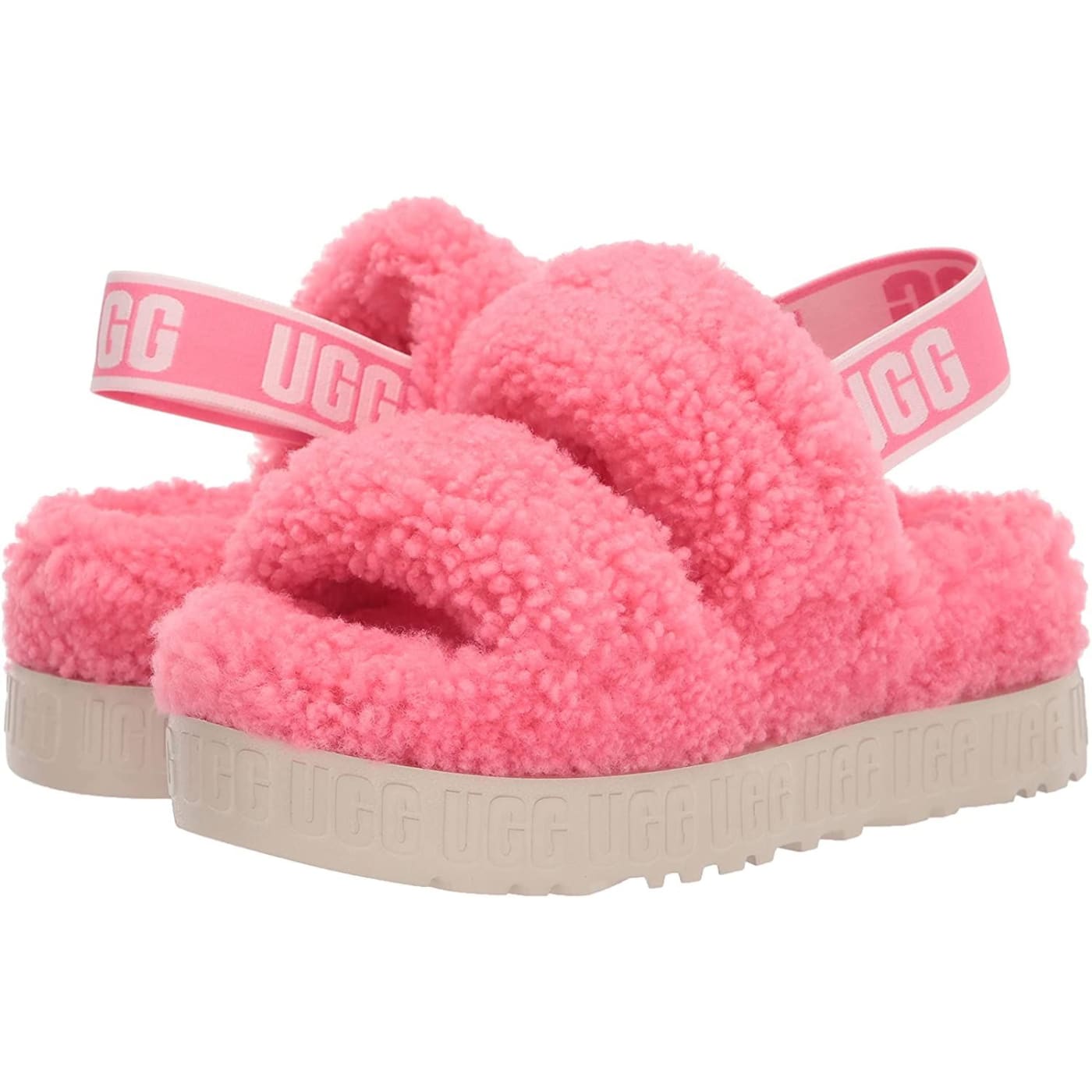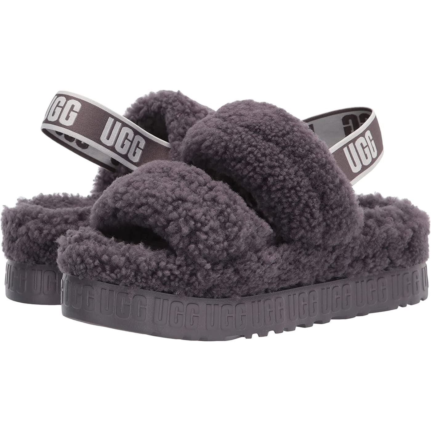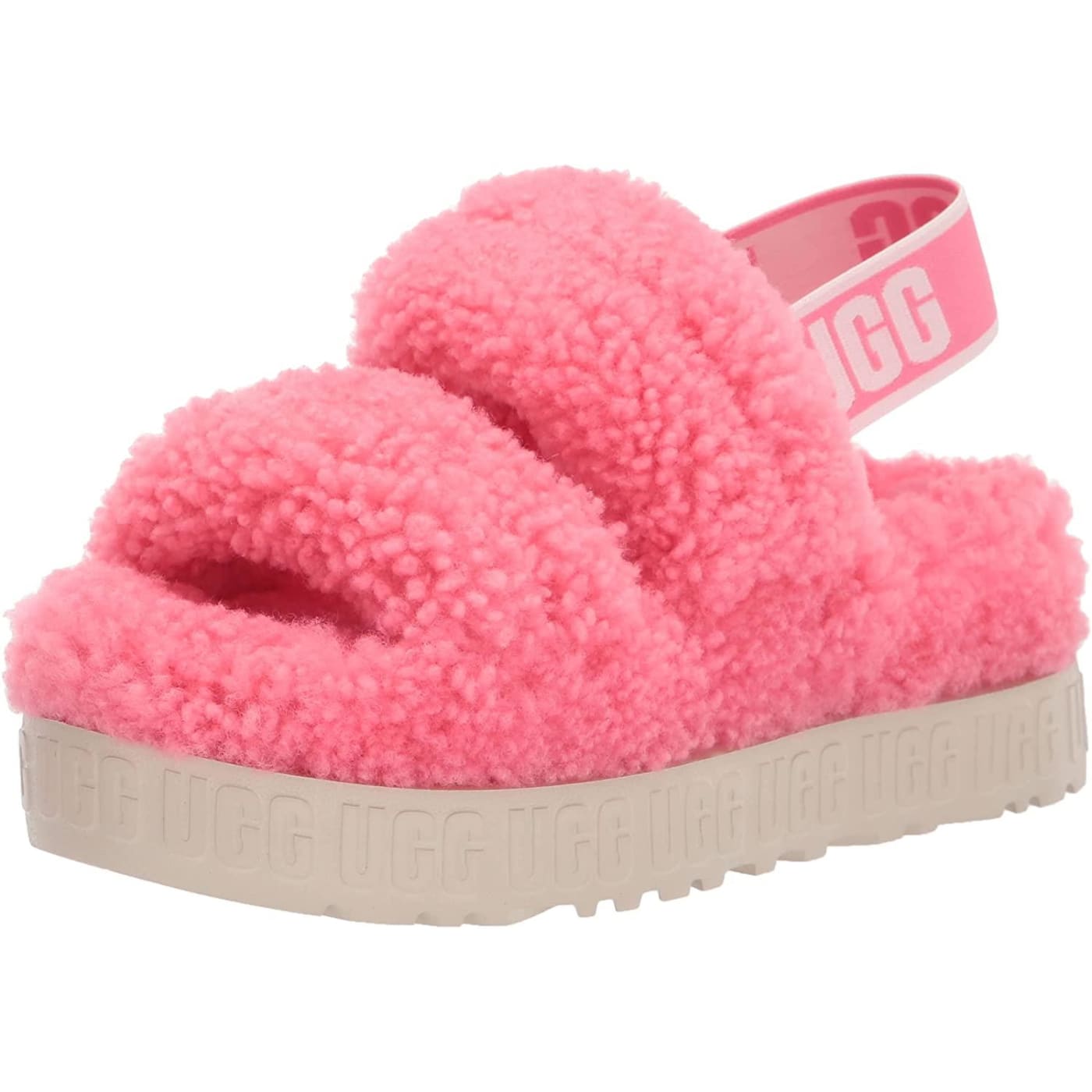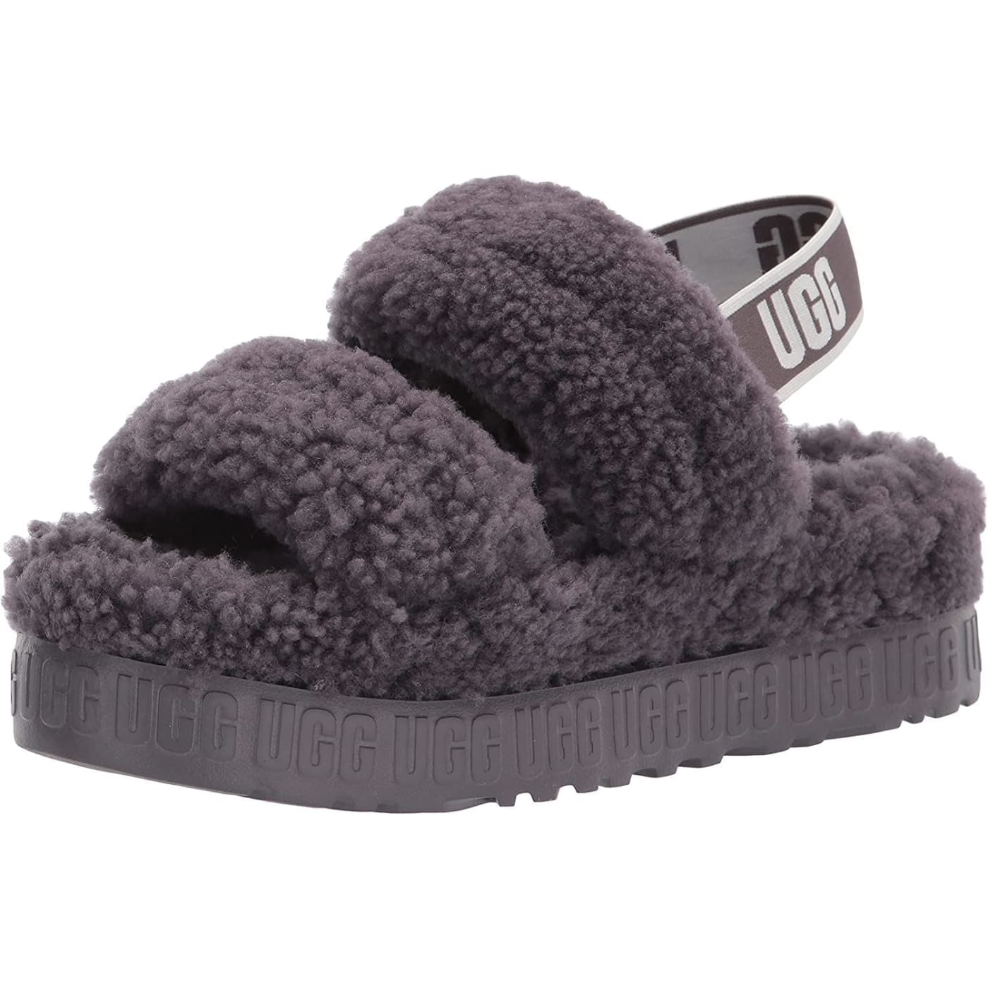 Merging our Oh Yeah and Fluffita, Oh Fluffita offers the best of both worlds with its strappy silhouette, curly sheepskin, and cushioned platform sole. Featuring a contoured footbed for a custom feel, it's lined with curly sheepskin and punctuated with graphic logo detailing, adding a bold statement to any look.